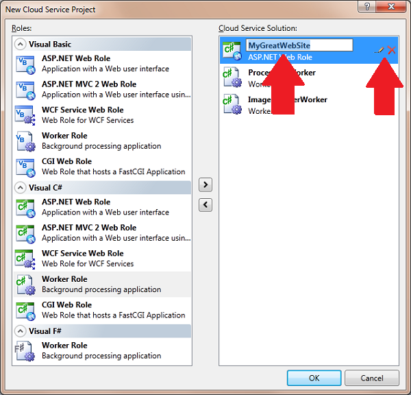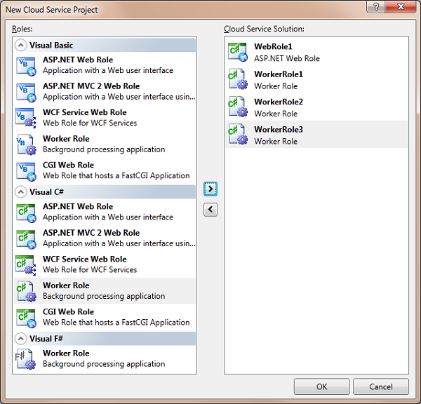 Selecting the Cloud Service template brings up an additional dialog box that allows you to add a number of additional project types. Currently VB.NET, C# and F# web role and worker role projects are supported. Selecting the project and selecting the arrow button adds this project to the Cloud Service solution.