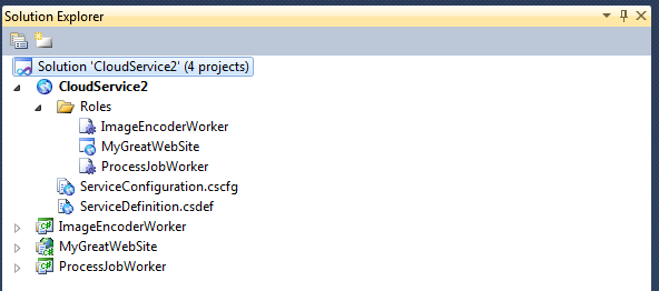 After clicking the OK button, a complete Cloud Service solution is created with all the projects properly added to the roles folder.