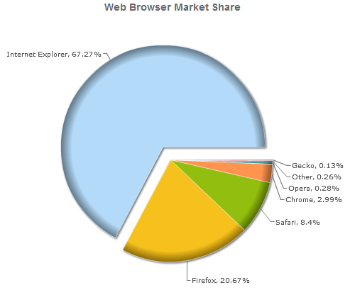Internet Explorer is losing its dominance. However, even a 10% drop would be equivalant to hundrends of millions of users stopping use of Internet Explorer (I wrote this article in February 2010 and as of October 2010 IE moved from 67.1% to 62.7%...about 5% drop in 8 1/2 months.). I don't see a 20% drop until two to three years from now. You can check out the web browser trends for yourself: http://statowl.com/web_browser_market_share.php