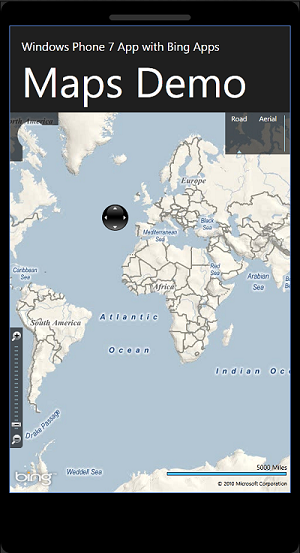 8) Now we FINALLY have our Bing Maps Silverlight control working on our Windows Phone 7 project. We can pan around. Notice that the zooming works. We can switch between arial and road modes.
