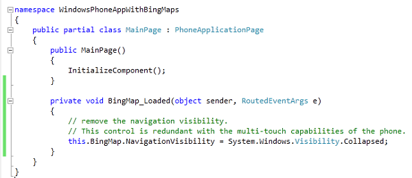 10) Using the Bing Map API, we can remove the navigation control. Create a loaded event for the control or the page (During the MIX conference, they mentioned you can use the OnPageNaviagedTo event as well) and simply add this code to the event: this.BingMap.NavigationVisibility = System.Windows.Visibility.Collapsed. Run the application now and you will see the navigation control removed. This removes the scaling and the mode switch but we can add those back later if we want to.