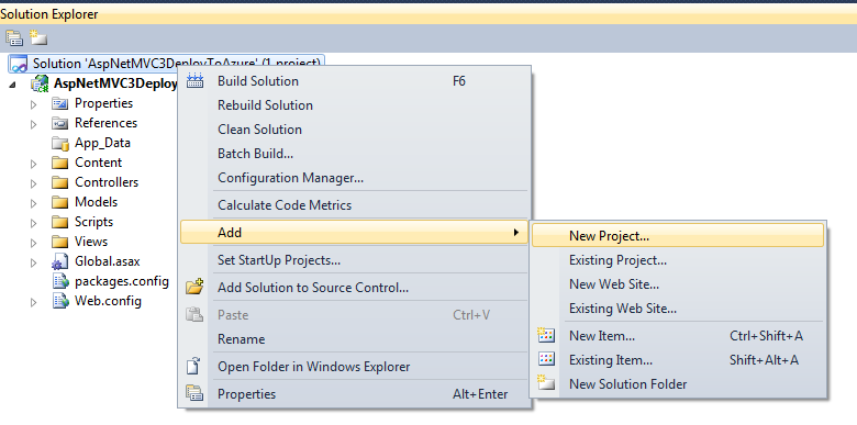 - In the Visual Studio 2010 Solution Explorer, right-click on the AspNetMvc4DeployToAzure solution and select Add -> New Project...
