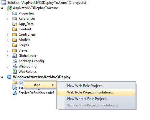- In the previous step, we ran the NuGet package that "converted" our traditional ASP.NET MVC 3 application to a web role by adding all the necessary assemblies. Therefore, this step is telling Azure that we want to add an existing Web Role from our current solution.