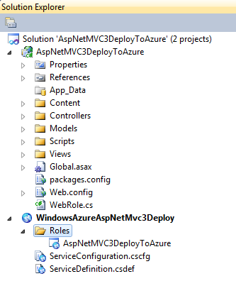 - Note that we have additional Azure assemblies referenced in the ASP.NET MVC 3 project, we have a new class WebRole.cs, the web.config has Azure elements in it and inside the Azure cloud project we have a new web role added