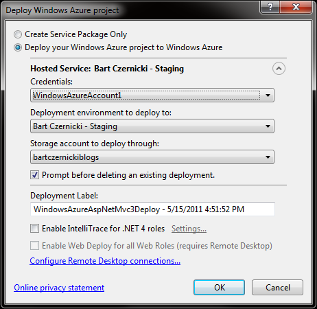 - I highly recommed you also select the "Enable Intellitrace for .NET 4 Roles". This will show you any errors that you get if you don't have the proper ASP.NET MVC 3 assemblies installed. Here is a good article on how you can view the IntelliTrace logs: http://www.nickharris.net/2010/09/how-to-enable-intellitrace-on-windows-azure/. For exampe, if you forget to enable "Copy Local" to true for the System.Web.Mvc.dll the Azure publish process will cycle and you will not know why.